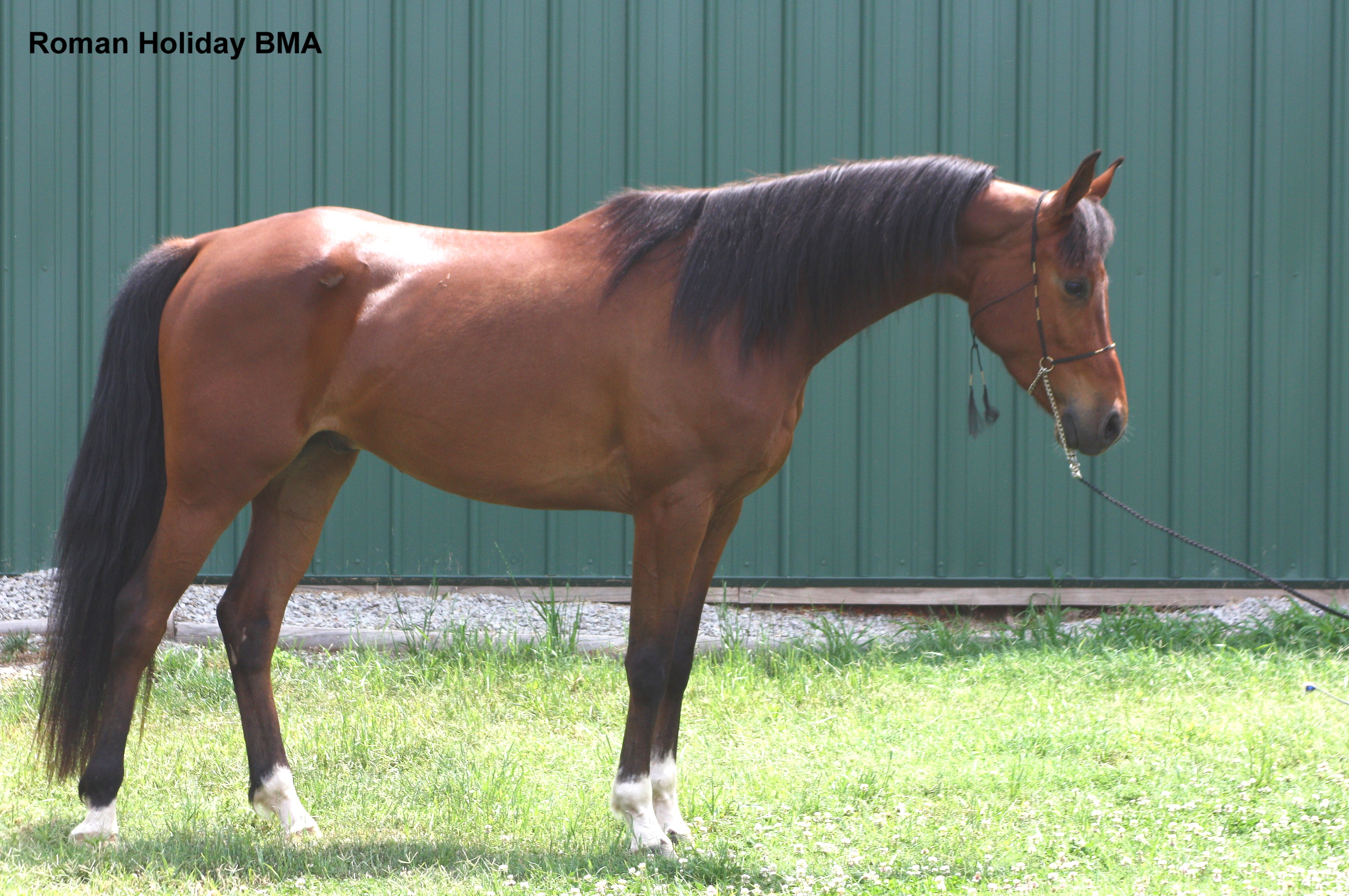 ROMAN HOLIDAY BMA: 4 yr old 15.3/4 purebred gelding. As you can see in the photo, Roman is a very kind horse. He's super willing and calm. He's a quieter horse than Tsaint or Ma Time and loves to be with people. When I turn him loose to eat grass, he just follows me around while I do chores! He's really smooth and very well trained. Breeders Sweepstakes. $6500. Video! https://www.youtube.com/watch?v=apORFGIqJoU UPDATE! Roman Holiday has found his owner with Denise Secino of Ocala Florida! Feel free to contact Denise regarding Firedance Farms horses! oakhillan@aol.com